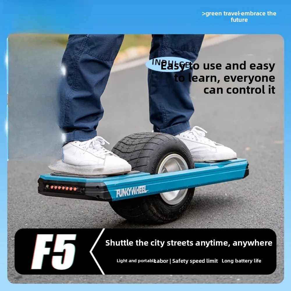 The F-5 Electric Unicycle Skateboard for Adults is a futuristic ride designed to combine fun, speed, and practicality. Featuring a unique land-skiing design, this one-wheel electric skateboard delivers a smooth and thrilling riding experience. Its self-balancing system makes it easier for beginners to learn while still offering exciting performance for experienced riders. Compact and portable, the F-5 is perfect for commuting, short-distance travel, or simply enjoying the outdoors. With its powerful motor and responsive controls, riders can glide effortlessly across city streets, sidewalks, and smooth trails. The advanced balance technology ensures stability and safety while riding at various speeds. Its lightweight design makes it easy to carry and store when not in use. Built with durable materials, the F-5 is reliable enough for daily use while staying stylish and sleek. The land-skiing style board allows for intuitive control, giving riders the sensation of surfing or skiing on pavement. This makes it not only a transportation tool but also a fun recreational gadget. The F-5 is a perfect blend of convenience, innovation, and excitement. Whether you’re commuting to work, cruising around town, or learning a new way to ride, this electric unicycle skateboard offers a unique and enjoyable experience.